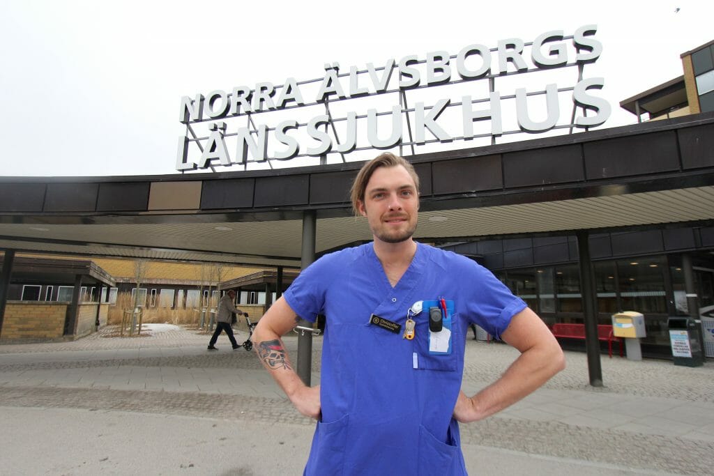 Christoffer Sandersson önskar att fler killar vill ge sjuksköterskeyrket en chans. I dag är knappt 12 procent av alla sjuksköterskor och barnmorskor i Västra Götalandsregionen (VGR) män. Foto: Fredrik Gustafsson
