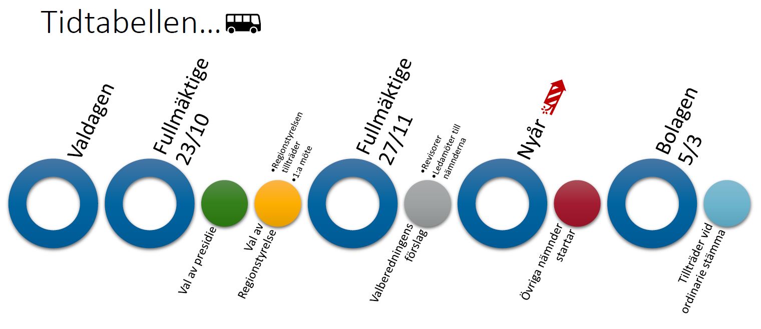 • Den 23 oktober väljer fullmäktige presidium för sitt eget arbete samt en ny styrelse. Den nya styrelsen sammanträder för första gången samma dag och påbörjar arbetet för mandatperioden.