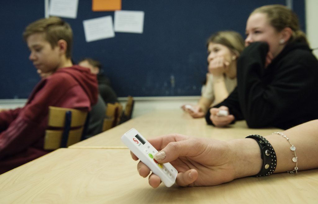 – Välkomna, vi använder oss av röd och grön knapp. Instruktioner kommer på skärmen, säger en man i blå overall som delar ut mentometrar till eleverna.