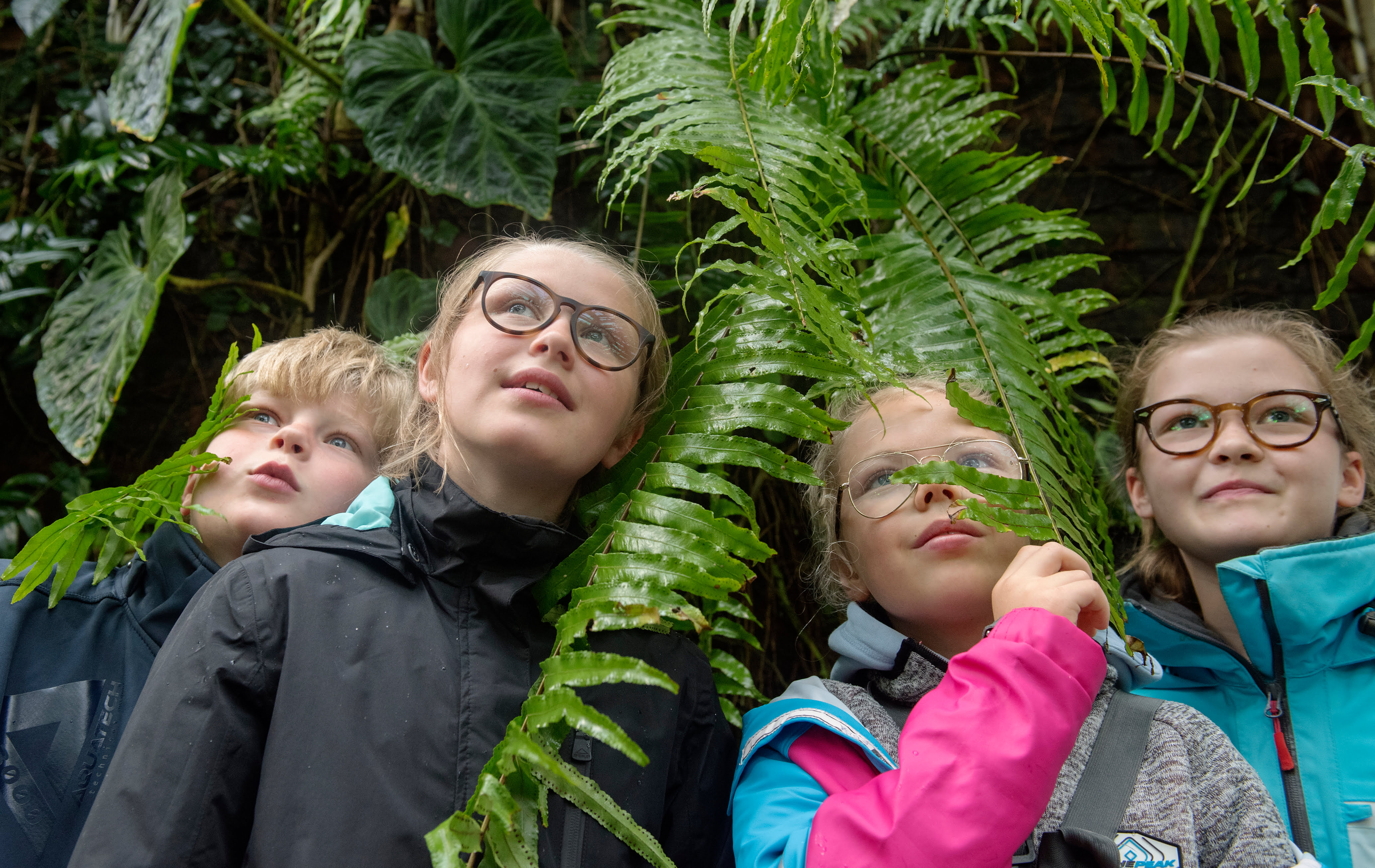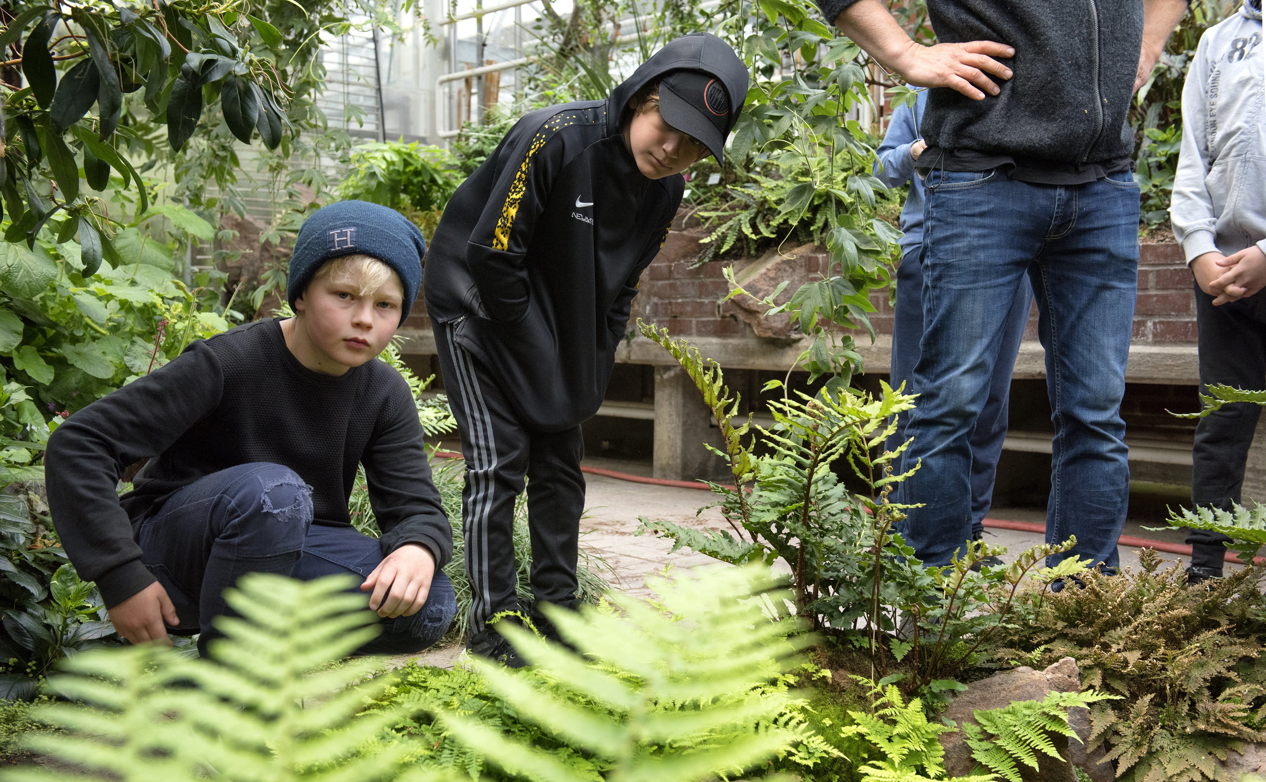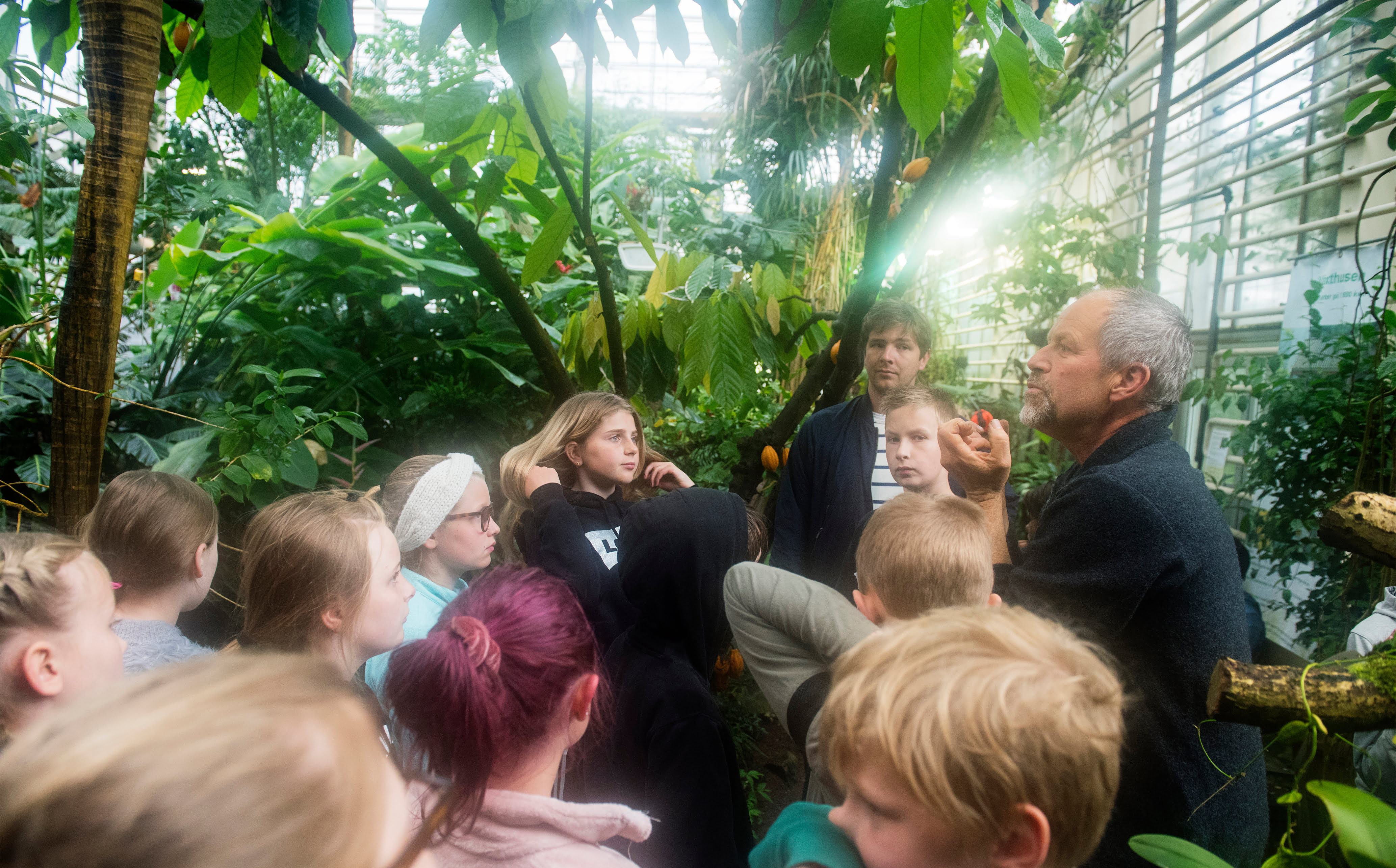 När barnen kommer in i växthusets entré får de hänga av sina blöta jackor i garderoben. Några huttrar till men de blir snart varma. Kennert leder in dem i regnskogsmiljö med varm och fuktig luft.