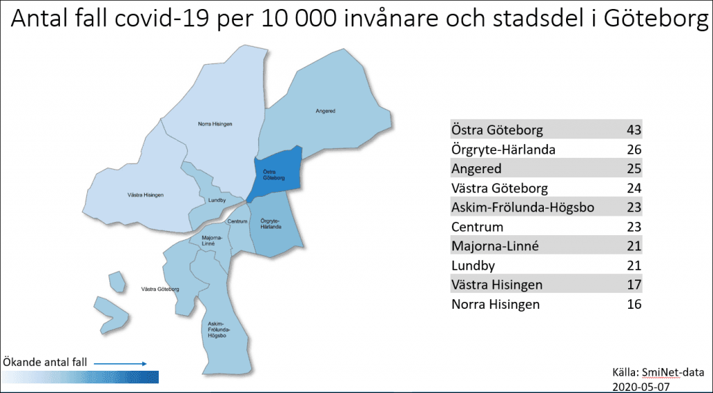 Siffrorna för stadsdelar (stadsdelsnämnder) har tagits fram efter att Region Stockholm redovisade motsvarande siffror och intresset ökade för hur det ser ut i Göteborg. Staden har flest konstaterat smittade i Västra Götaland och ligger på andra plats efter Vänersborg i relation till folkmängd (per 10 000 invånare).