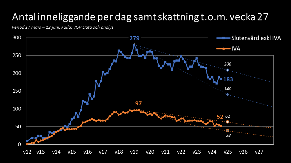 I sjukvården går utvecklingen fortfarande enligt Västra Götalandsregionens prognoser. En långsam minskning av antalet inneliggande patienter och patienter i intensivvård. Men det skiljer mellan sjukhusen och trycket på vården är fortfarande högt.