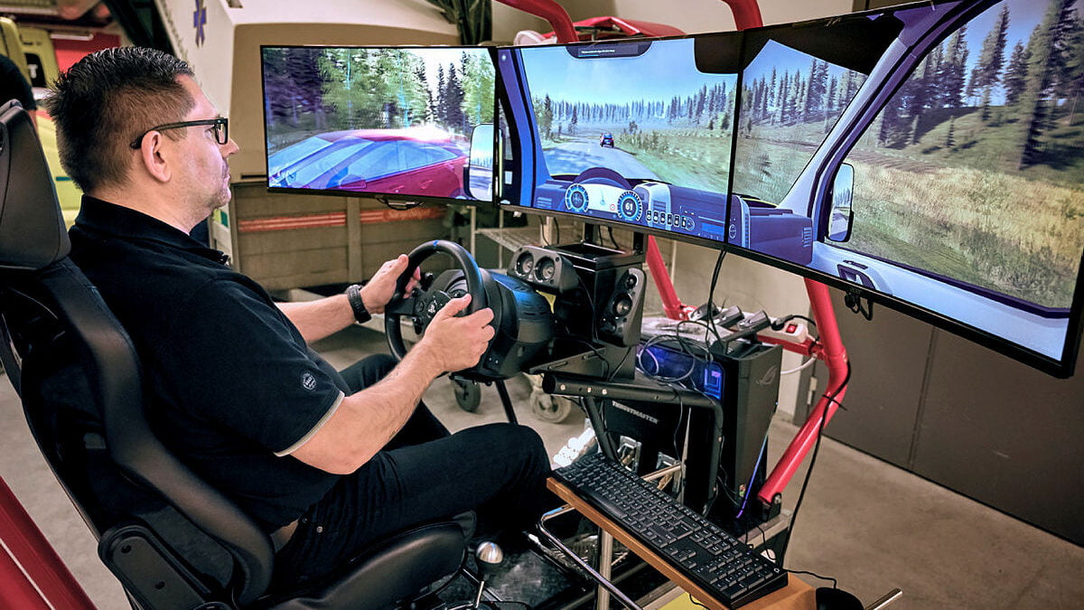 Allt sker på tre bildskärmar som Davor har framför sig, men utryckningen i körsimulatorn skulle kunna inträffa i verkligheten.