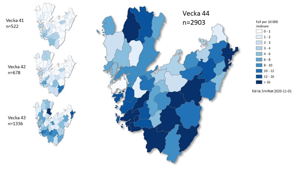 Antalet nya bekräftade fall av covid – 19 i Västra Götaland denna vecka är redan uppe i 1392 och förväntas överstiga förra veckans nivå som var 2984 nya bekräftade fall. Som bilden nedan visar har smittspridningen på bara några veckor ökat kraftigt i merparten av Västra Götalands kommuner. Ju mörkare blått, desto högre smittspridning.