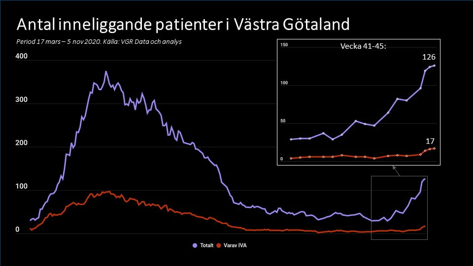 Spridningen av covid-19 fortsätter öka oroväckande fort och nu märks det tydligt även i vården. I nästan alla kommuner i Västra Götaland syns kraftiga ökningar och antalet inneliggande patienter ökar snabbt på sjukhusen. Smittskyddsläkare Thomas Wahlberg tvingas nu också konstatera att smittan letat sig in på äldreboenden.