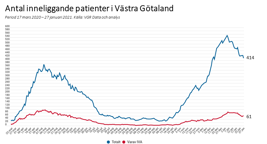 Den minskande smittspridningen märks också på sjukhusen där antalet inneliggande minskar. Under onsdagen låg 414 covid-19-patienter inne på sjukhus, varav 61 på intensivvårdsavdelning. Men antalet inneliggande är betydligt fler än vårens topp, maj 2020, då 375 patienter vårdades med covid-19 samtidigt.
