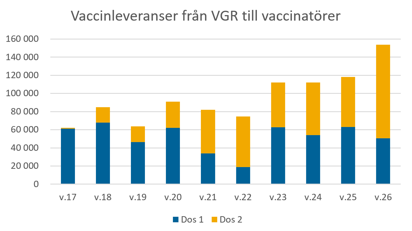 Nästa vecka, vecka 17, kommer VGR leverera 60 640 doser vaccin mot covid-19. Merparten är vaccin från Pfizer och det handlar nästan uteslutande om dos 1 som skickas till vårdcentralerna.
