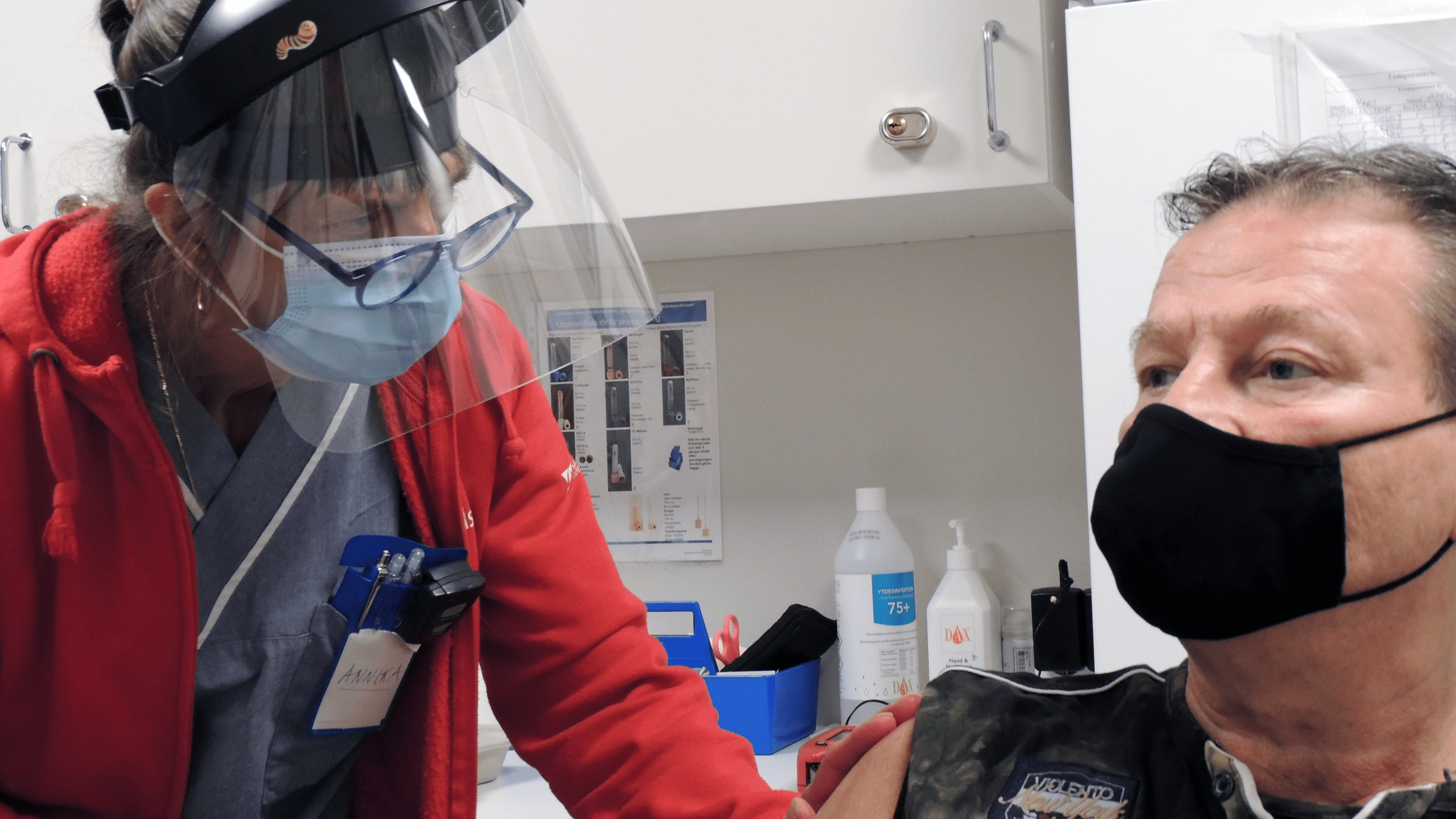 Det har blivit dags för Lars Nilsson att följa med in i vaccinationsrummet. Annika Lindén ber honom att kavla upp höger ärm och ett litet stick senare är allt klart. Lars får sitt vaccinkort och en ny tid på måndag vecka 26.