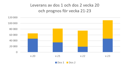Under nästa vecka, vecka 20, kommer totalt 65 000 doser vaccin mot covid-19 skickas till vaccinatörer i Västra Götaland. Av dessa avser 47 000 doser dos ett för gruppen 50+ (födda 1971 och tidigare), fortsatt vaccination av medicinska riskgrupper på sjukhusen, samt LSS-personal. 18 000 doser är öronmärkta för att användas till att ge dos två.