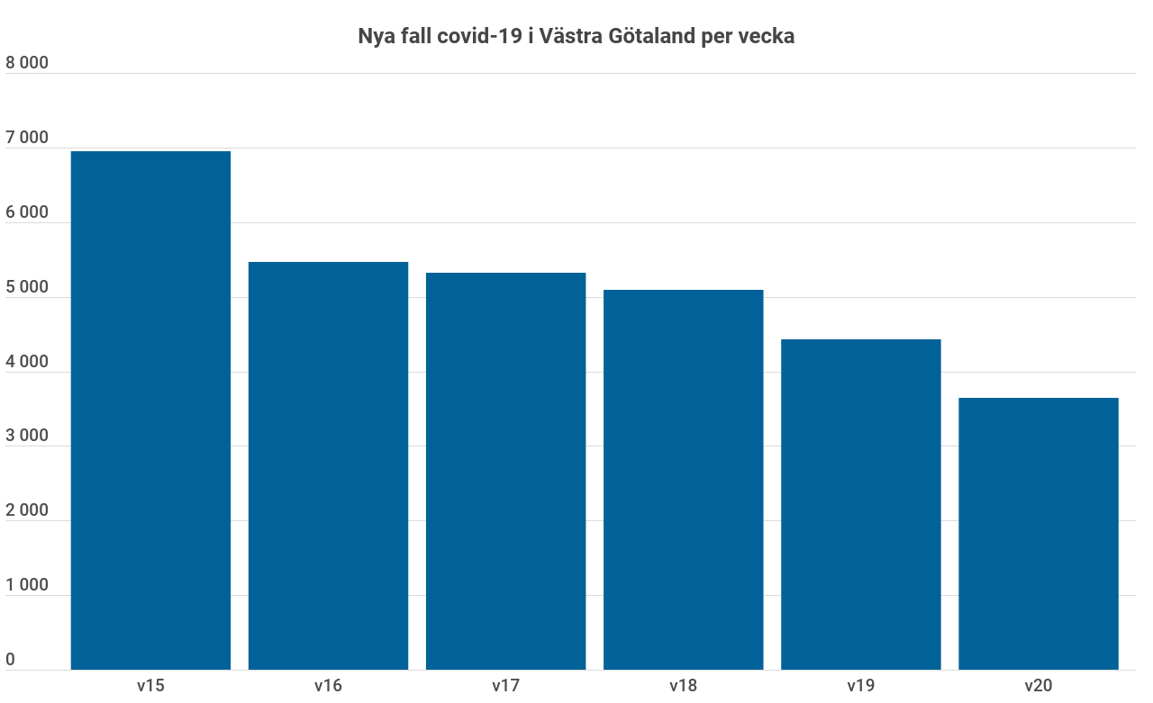 Under vecka 20 konstaterades 3 646 nya fall av covid-19 i Västra Götaland. Det är en minskning med 17 procent jämfört med föregående vecka och femte raka veckan med en minskande smittspridning.