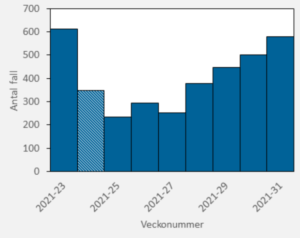 Under vecka 31 konstaterades totalt 580 nya fall av covid 19 i Västra Götaland. Det är fjärde veckan i rad som antalet nya fall ökar.