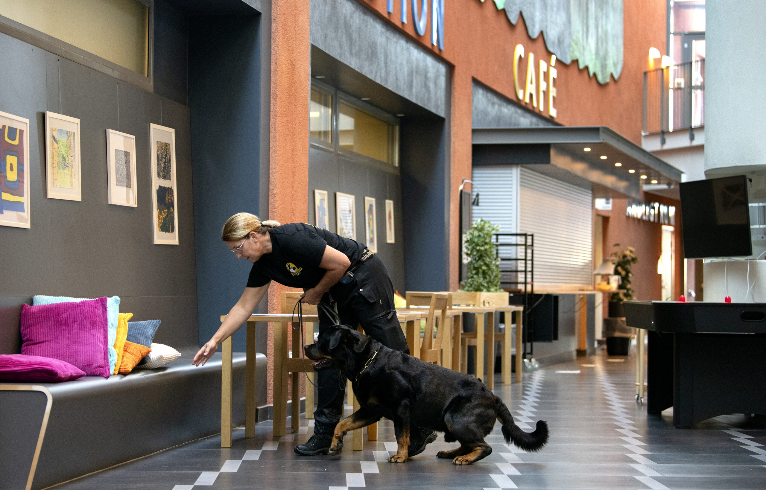Rottweilern Bosse (5) är en stabil, och som det heter på hundspråk, ”nervfast” hund. Han signalerar lugnet själv där han lufsar runt i korridorerna med Marika. Doriz (1), en engelsk staffordshire bullterrier, är betydligt spralligare, men så är hon ännu en unghund under utbildning. Ytterligare en hund, rottweilern Joy (2), arbetar på enheten med sin förare Alexander Hansson, mentalskötare. Tillsammans utgör de tre hundarna ”hundenheten”, som är en del av verksamhetens säkerhetsenhet.