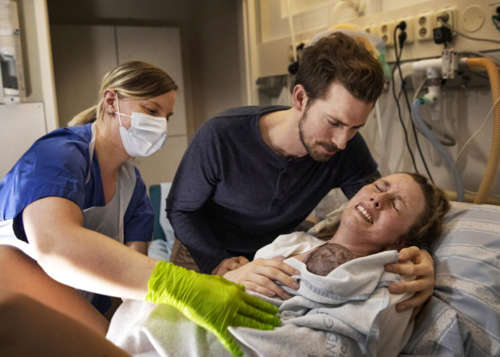 Det går ytterligare några timmar. Den födandes partner är på plats, och ståendes på knä föder hon till slut fram sitt barn. I det nedsläckta rummet hörs ett första darrande bebisskrik.