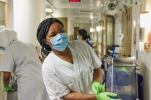 – Det har varit väldigt mycket, berättar Cornelia Röing, undersköterska på BB-avdelningen. Patienter in och personal ut. Som undersköterska har man inte känt sig lika betydelsefull som barnmorskorna. Och man får sex till åtta sms om dagen om sjukluckor. Eller vi står vid tavlan och ser: lucka i natt. Och alla tittar på varann tills nån säger, okej, jag tar den. Man vill inte sätta sina kollegor i skiten. I stunden kan jag tänka – är det värt det? Men så fort jag kommer in känns det så bra, jag har så fina kollegor.