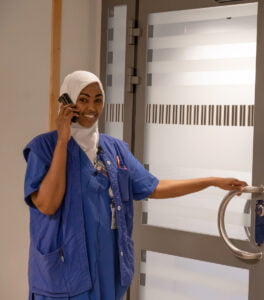 ”Jag har jobbat som kulturtolk här på kvinnokliniken i sex år nu, jag jobbar med somaliska. Vi är två kulturtolkar som jobbar måndag till fredag. Vårt uppdrag är inte bara tolkning utan vi förklarar sjukhuskulturen här i Sverige och skillnader mellan hur sjukvårdssystemet fungerar här och i patientens hemland.
