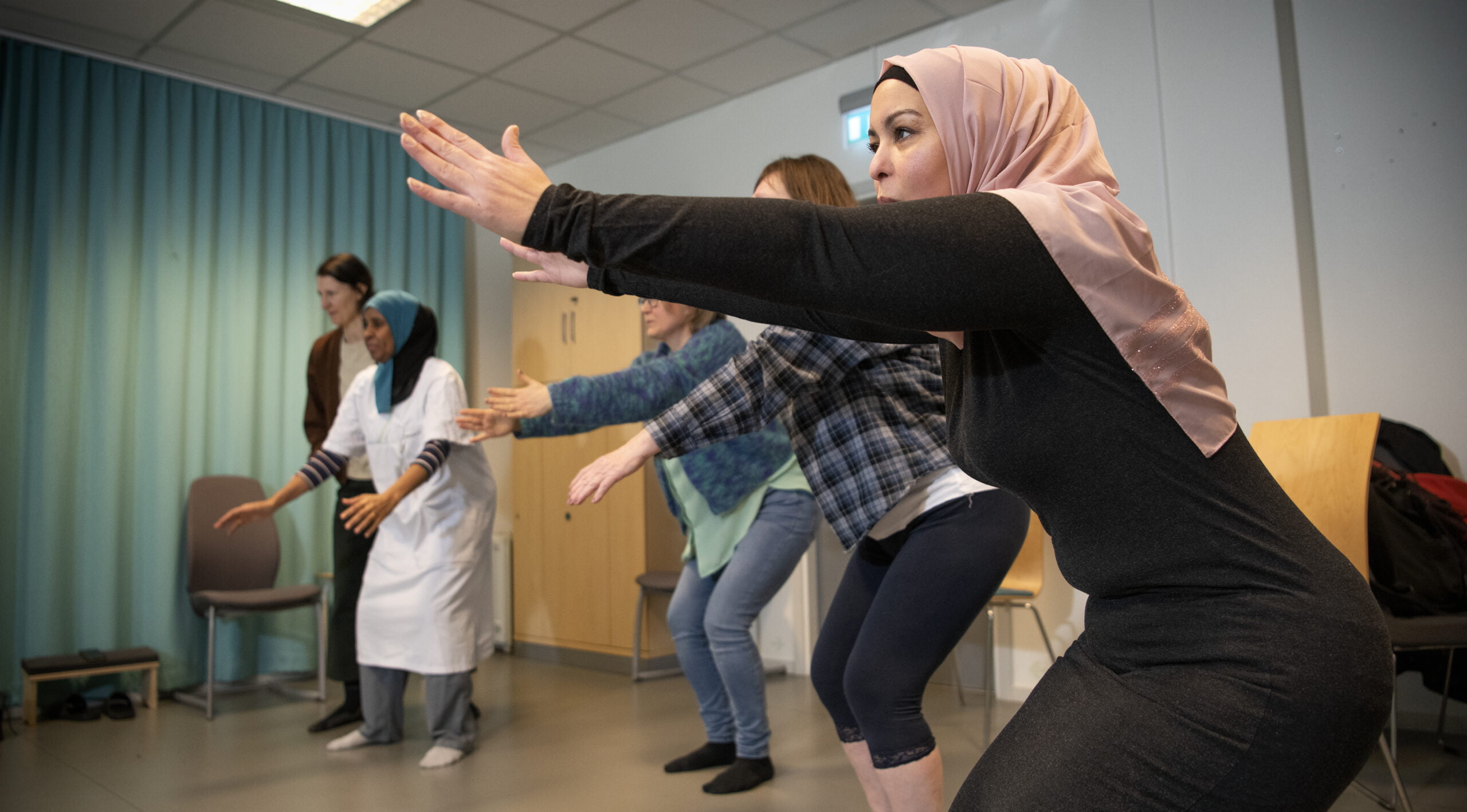 Klockan är strax efter 11.15 och fysioterapeuten Tina Mortensen har just dragit igång onsdagens träningspass med enkla uppvärmningsövningar. Framför henne står en filmkamera på en papperskorg som följer hennes rörelser och instruktioner.