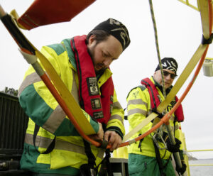 Ambulanssjuksköterskan Ida Jogeland sträcker ut en lång båtshake med en så kallad rescue sling, som ska ge flythjälp och göra det möjligt att vinscha upp personen ur vattnet. Första försöket misslyckas, men andra gången får hon tag runt fendern och hennes kollega kan vinscha upp den ur vattnet.