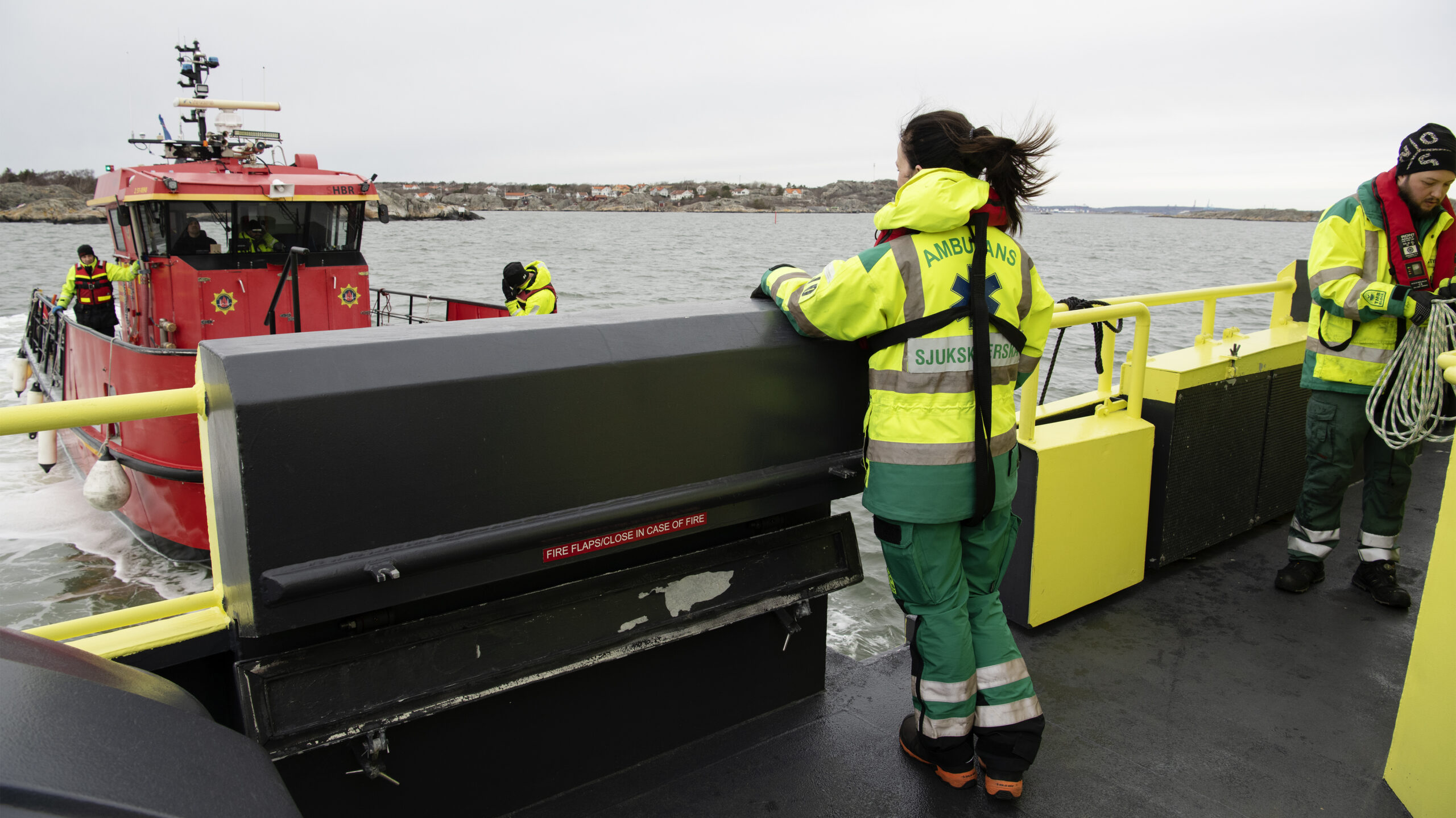 Även räddningstjänstens brandbåt Göte 2 är ute och övar utanför Styrsö. De båda fartygen passar därför på att borda, vilket innebär att den mindre brandbåten lägger till vid ambulansbåten.