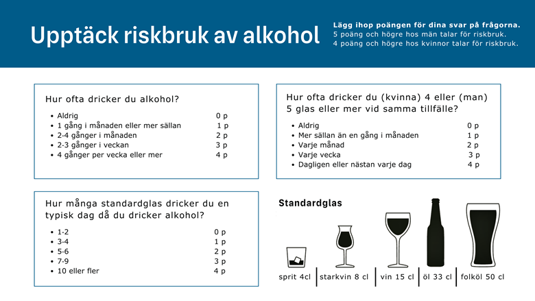 Även den som inte har ett riskbruk riskerar att trilla dit under sommaren och därför är det viktigt att ha koll på sitt alkoholintag. Bilden nedan visar ett sätt att mäta sitt drickande. Genom att svara på frågorna och lägga ihop poängen kan man få en indikation på om man dricker för mycket.